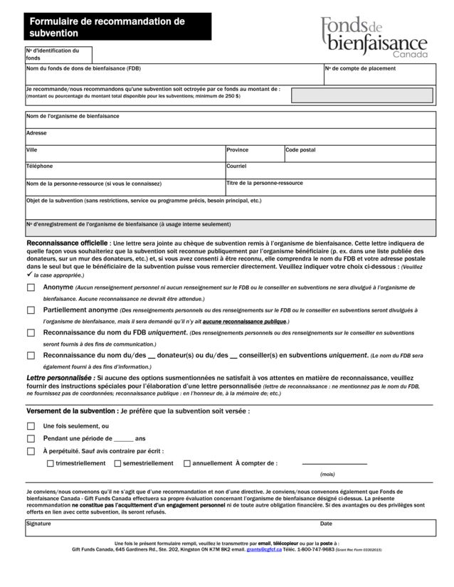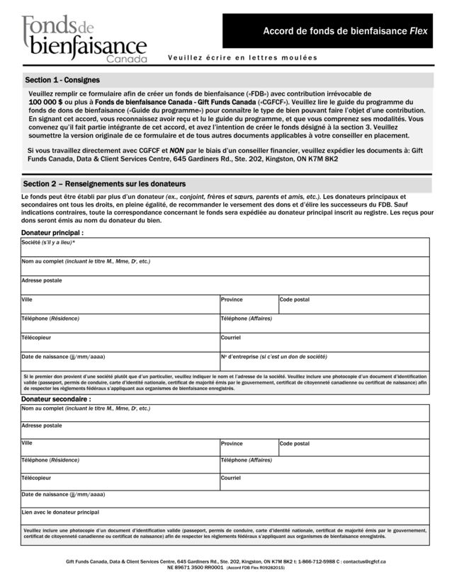 Des formulaires d’accord existent pour établir des fonds de dons de bienfaisance ou faire des contributions supplémentaires aux fonds existants. Des recommandations de subventions peuvent être faites au moment de l’établissement du fonds ou en remplissant les sections concernées ultérieurement. Les formulaires sont fournis au format Adobe Acrobat. Après en avoir imprimé un exemplaire, veuillez remplir l’accord conformément aux instructions figurant sur chaque formulaire.